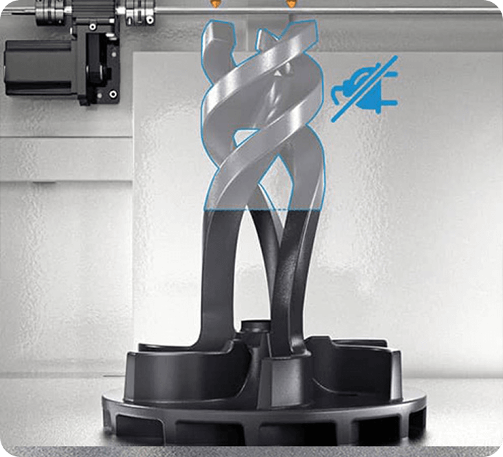Sicherheitstür-Überwachung stoppt den Druck sofort bei Öffnung. Stromausfall-Wiederherstellung, Filamenterkennung und automatischer Backup-Düsenmodus sichern mehrtägige Druckprozesse ohne Produktionsverlust.